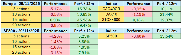 Ce mois de Novembre a été plutôt négatif aussi bien en Europe qu'aux USA. Voici les performances brutes des portefeuilles Momentum: