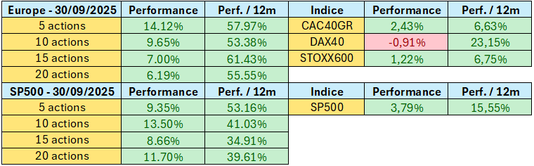 Ce mois de Septembre a été très positif aussi bien en Europe qu'aux USA. Voici les performances brutes des portefeuilles Momentum: